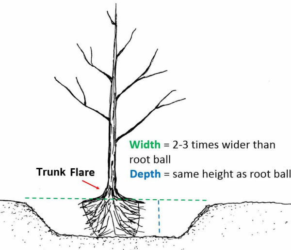 Plant the tree. Place the tree in its new hole with the top of the root ball just slightly (no more than an inch or two) above ground level. Planting trees too deep is a pretty common mistake, but this handy video on planting trees at the proper depth will help you get it right. When the tree is in place, cut and remove the burlap and twine, and then fill the hole with soil from the original planting site. Protect from transplant shock. The tree is set, but your job is not quite done!