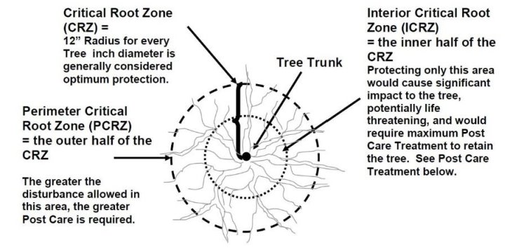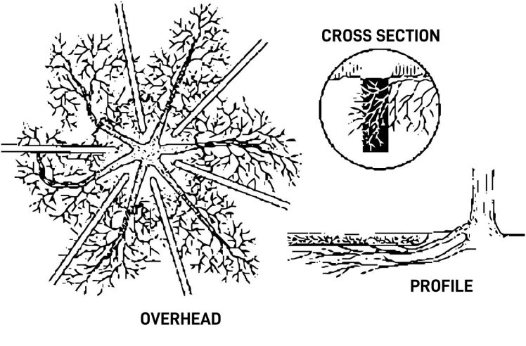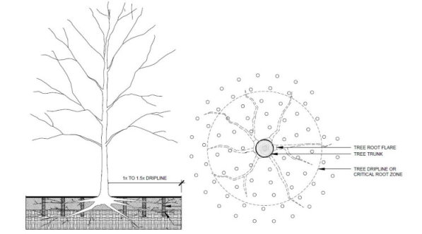 Radial Aeration More recent research has shown promising results with another method of aeration called radial aeration. Narrow trenches are cut with a compressed air gun or a mattock in a radial pattern throughout the root zone. These trenches appear similar to the spokes of a wagon wheel. It is important to begin the trenches 4 to 8 feet from the trunk of the tree to avoid cutting any major support roots. The trenches should extend at least as far as the drip line of the tree. If the primary goal is to reduce compaction, the trenches should be about 8 to 12 inches in depth. They may need to be deeper if the soil grade has been raised. The narrow trenches can be backfilled with topsoil or compost. Root growth will be greater in the trenched area than in the surrounding soil. This treatment can give a tree the added boost it needs to adapt to the compacted soil or new grade. Vertical mulching and radial trenching are techniques that may improve conditions for root growth. If construction-damaged trees are to survive the injuries and stresses they have suffered, they must replace the roots that have been lost.